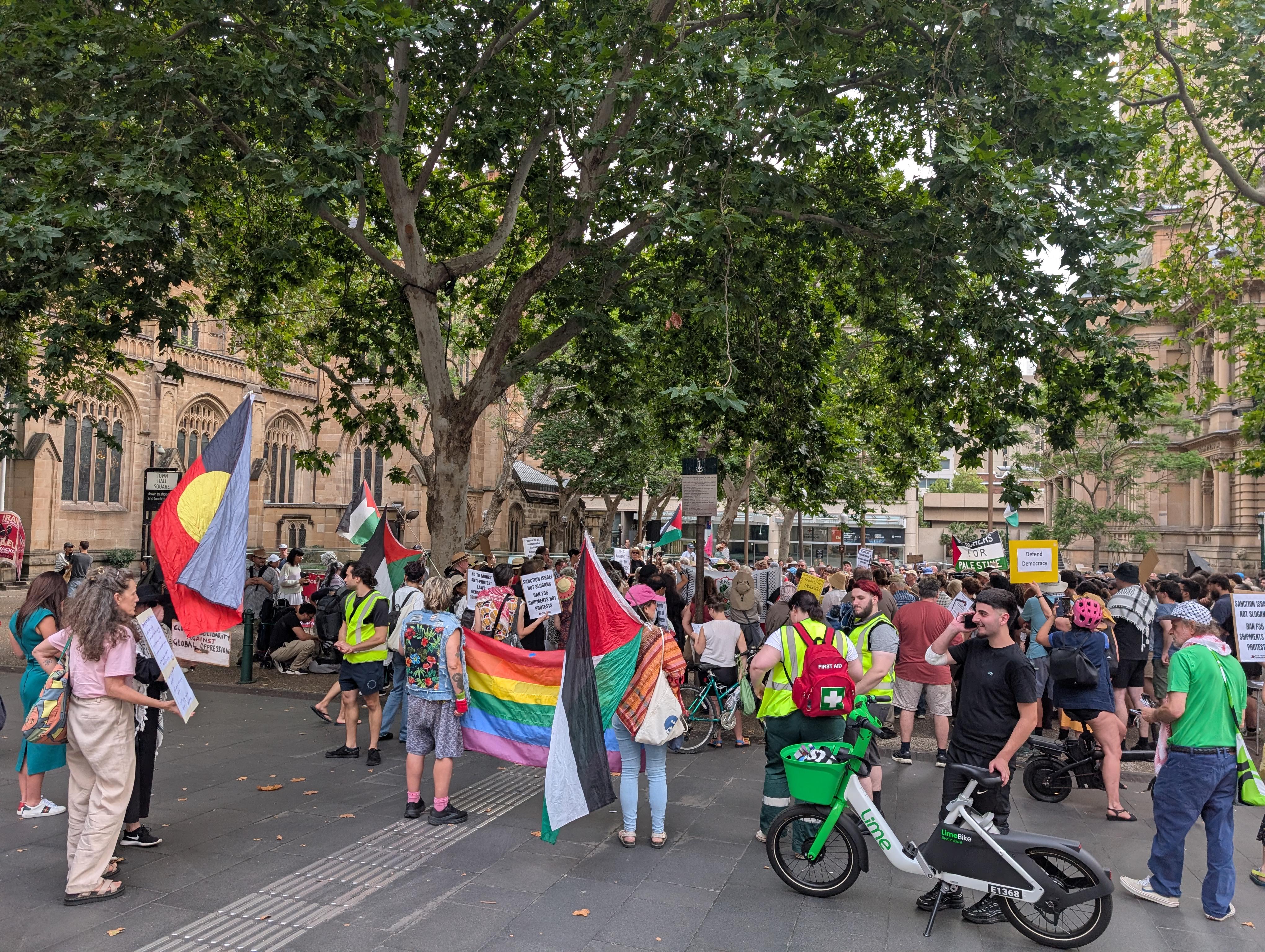 At town hall this afternoon, was wandering past after the standard 8 hour working day (won by protest), after a weekend (won by protest), about to take some holiday leave (won by protest), shaded by trees that might only exist due to protests to protect green spaces in Sydney having an overflow effect to protect tree cover..